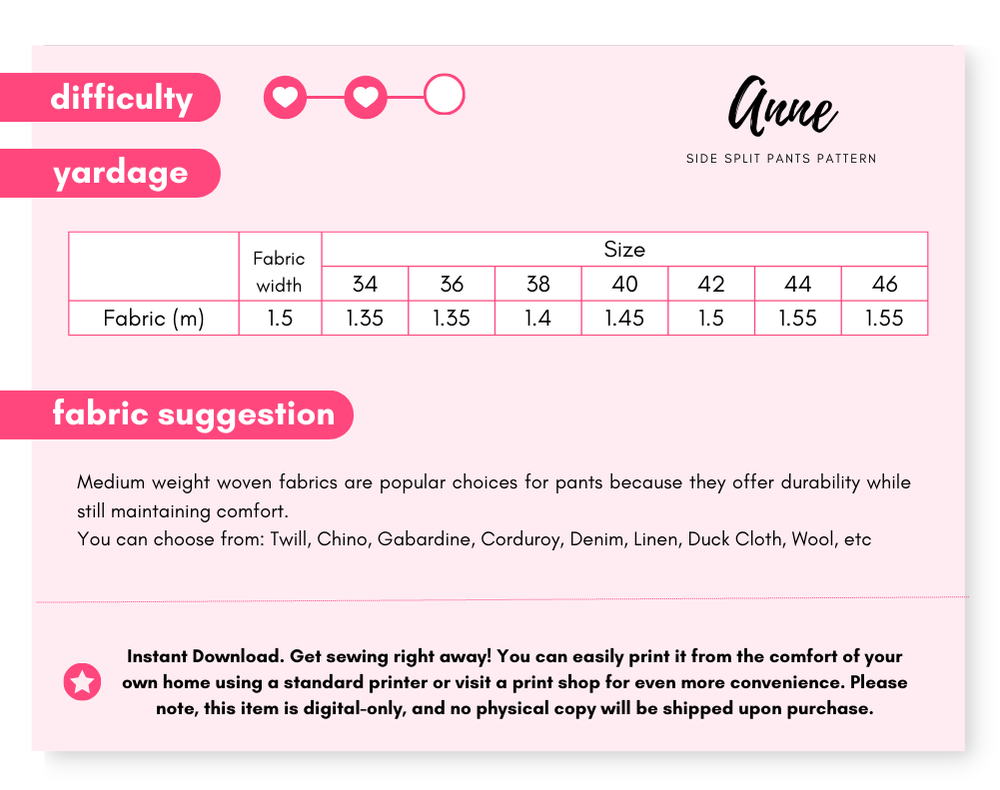 With this side split pants pattern, you can create a versatile and stylish look for any occasion. Made from a comfortable fabric, these pants are a great choice for busy days when you need something that looks great and feels even better. So don't miss out - grab this pattern and start sewing your own pants today!